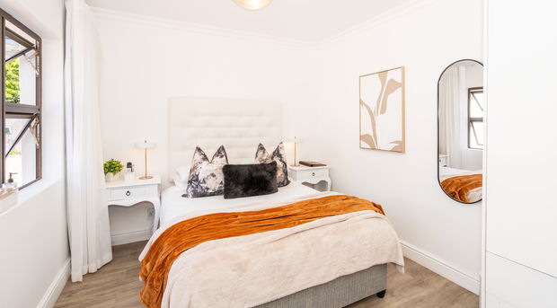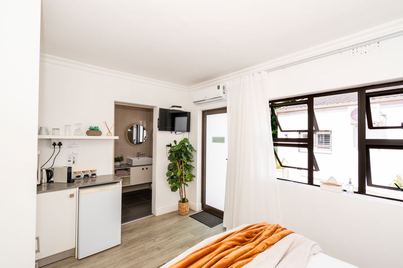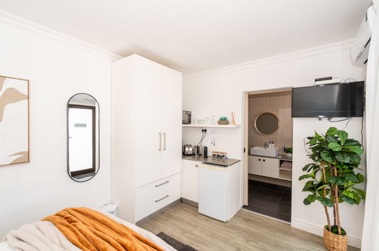This suite offers a luxury queen size bed. It offers a large shower; his and her basins with coffee bar; kettle; toaster and microwave and has access to a private courtyard patio.