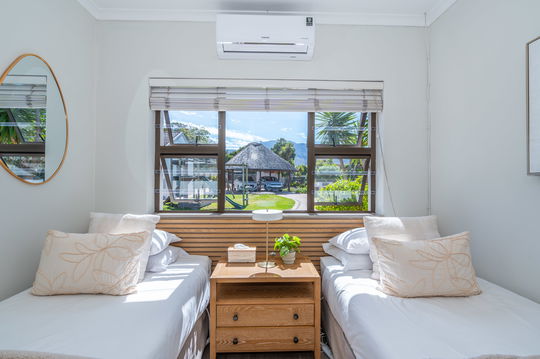 The Gardenia Cottage is a 2 bedroom unit that can convert to a 3 bedroom unit (Arum unit) with views of a lush garden and pool. It has one queen room with the second bedroom being king or Twi beds. The queen bedroom has a 32" flat-screen smart TV.
