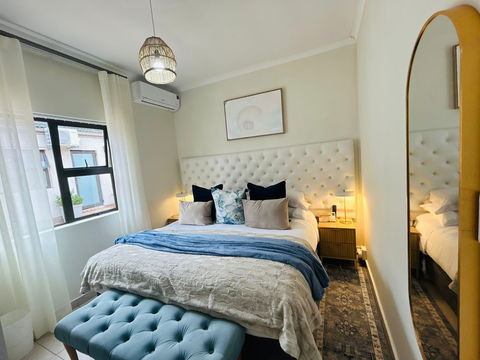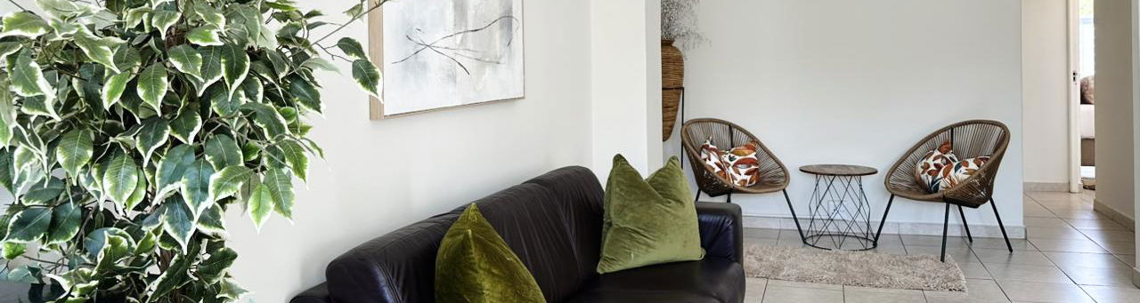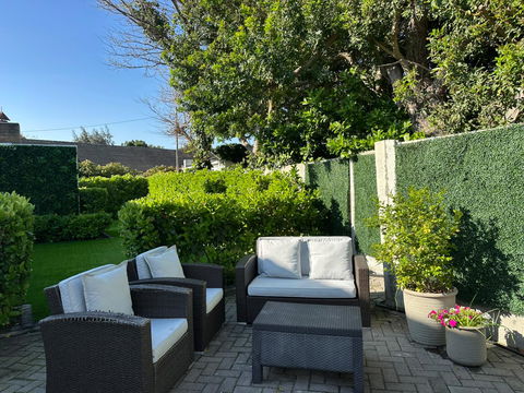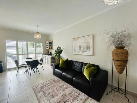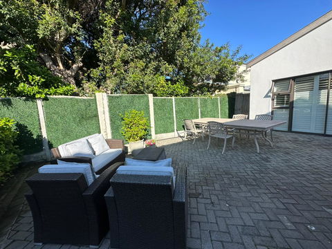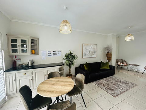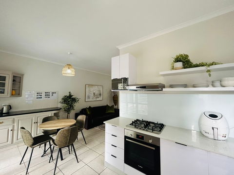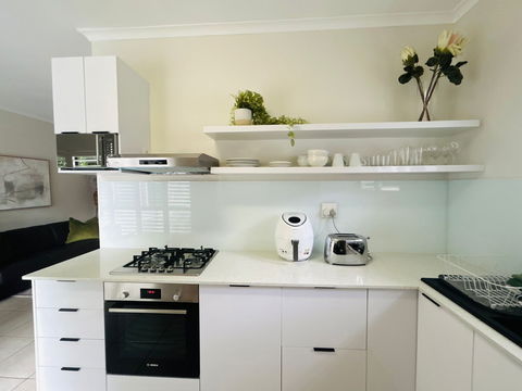 The fully equipped open plan kitchen, lounge area that opens up to the garden area. The kitcehn is fully equiped with kettle, toaster, airfreyer, nespresso machine with stove gas hob and oven.
