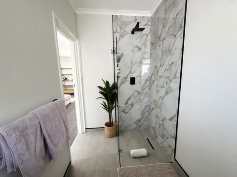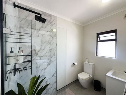 The bathroom offers a modern touch with a vanity, toilet and open walk in shower with Charlotte Rhys amenities.