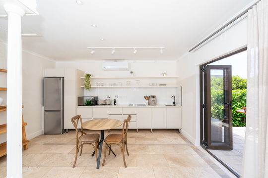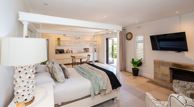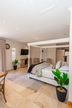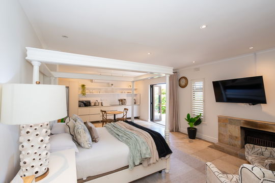 This is a self-catering unit on the ground floor and boasts of space and the fact that it has an open-plan kitchen and room. It has a queen-size bed, a bathroom with a shower, and Charlotte Rhys amenities.